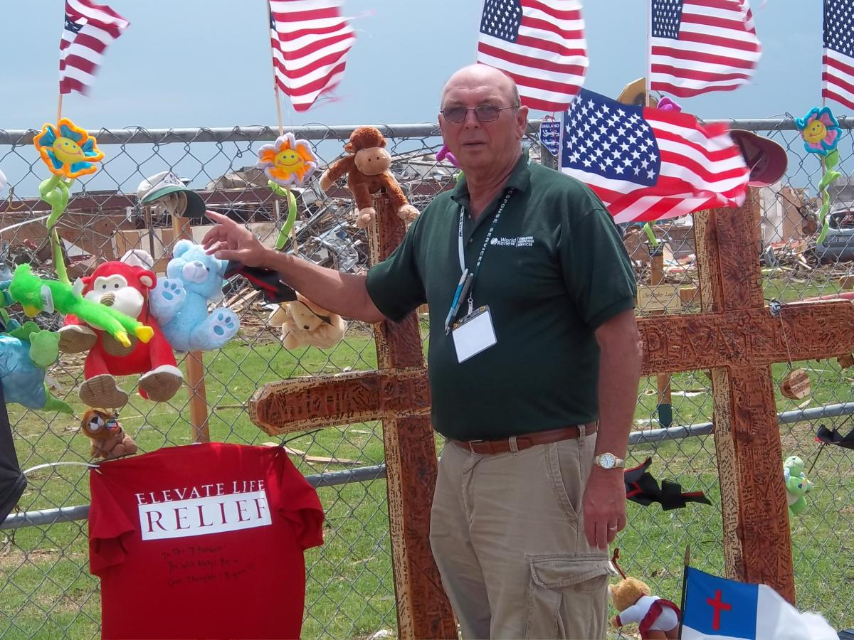 “At Plaza Tower, we found seven 5-foot crosses leaning against a fence that had become an impromptu memorial,” Rich said. “People left teddy bears and other stuffed animals, flowers, t-shirts, and toys along the fence. We left a World Renew DRS hat as a remembrance for the children who died, and we prayed as others gathered there to do the same.”