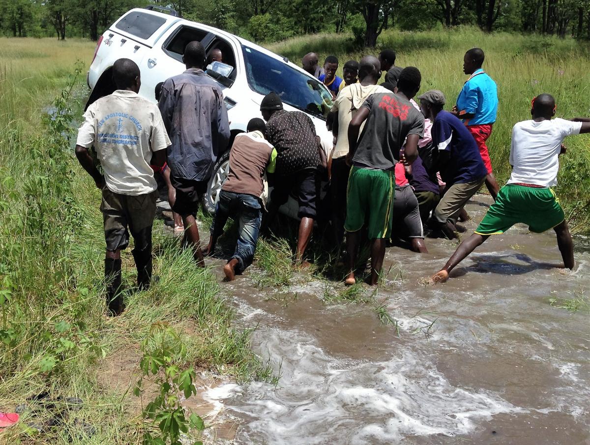 World Renew provided two vehicles for its transportation needs: a 2015 Ford Ranger and an older Toyota Hilux. Both are equipped with four wheel drive; a feature we often need. Once we turn off the tarmac we enter the ‘bush’ where the villages can be reached via a network of sand tracks designed for ox and donkey cart travel rather than motorized vehicles, much less our supply vehicles which deliver the food. Navigating this maze of roads has proven to be a considerable challenge as they may include huge mud puddles, virtual ‘rivers’ of water, tree stumps, fallen trees and sand traps.