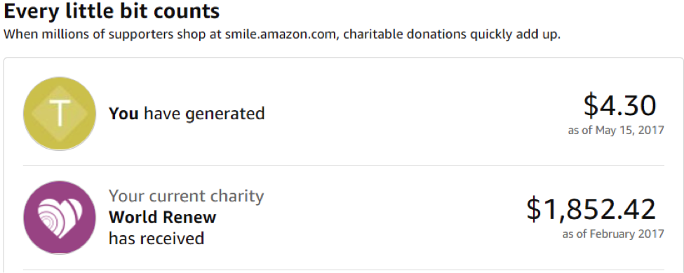 By navigating to smile.amazon.com instead of www.amazon.com, one can effectively ask Amazon to make a donation following each purchase. In fact, they will donate 0.5% of the subtotal to the charity of your choice, and you can choose World Renew. It’s easy, every time you think of making a purchase at Amazon, type smile first: most browsers will autocomplete the rest of the web address and any purchase you make will then trigger a donation to World Renew. To get to $3.34, you’d need $668 purchased at www.smile.amazon.com. Now that seems like a lot, it may take a while and that’s ok; it took a long time for the widow to get justice too. However, many people already do shop at Amazon. A college student could easily spend that much on books in a few years. I can see what my contribution has been over the last few years…